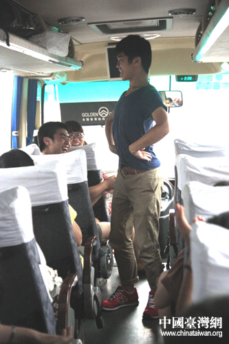 前往苏州的路上,来自台北教育大学的陈昱达在车上表演舞蹈。(中国台湾网 孟雅诗 摄)