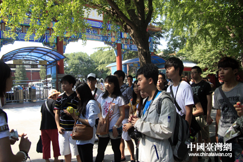 中国台湾网8月10日北京消息 “啊,原来你们也看康熙哦”,“是啊,在网上就能看到”,“奇怪耶,原来你们的七用手势比是这样的,我们好不一样哦”……从娱乐到生活,从台北到北京,同为“90后”,年纪相仿的两岸学子们一见如故,相谈甚欢。8月9日当天,在大陆志愿者的陪同下,台湾青年学生交流团走进北京的大街小巷。雍和宫、国子监、南锣鼓巷、后海,这里的点点滴滴都记录下了同学们留恋的背影,见证了两岸学子沟通交流的美好时刻。