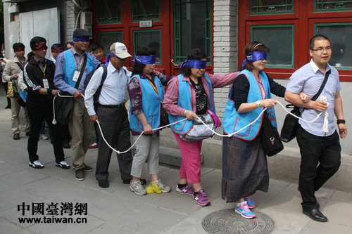 中国台湾网5月15日北京消息 台湾2013两岸NPO发展与推动交流参访团今天上午来到北京红丹丹教育交流文化中心,在志愿者的引导下,切身体验了盲人的日常生活以及他们是如何欣赏影视作品的。