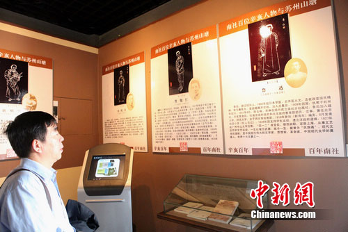 中新网苏州10月8日电(李克祥)8日,《南社百位辛亥人物与苏州·山塘》纪念展在中国南社纪念馆开幕。这是国内外首次举办的“辛亥革命与南社”展览,通过展出大批南社人物的遗物、生平事迹等,翔实的展现出南社人物发起了“辛亥先声”,是“辛亥革命”取得成功不可或缺的一支力量。