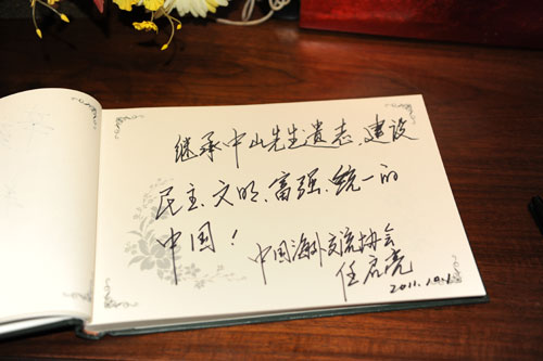 中国海外交流协会副会长任启亮在马来西亚槟城孙中山纪念馆题字缅怀革命先贤。
