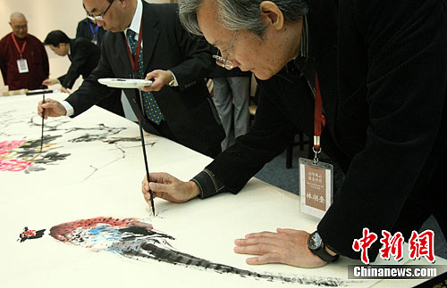 10月8日,来自中国台湾、中国香港、中国澳门和中国大陆的两岸四地以及海外华人等百位艺术家汇聚北京中国美术馆参加《百年风云·壮志丹青——纪念辛亥革命100周年美术作品展》笔会,台湾著名画家刘国松、罗青、刘昌汉李奇茂,澳门著名画家孙蒋涛、刘富业、林冬梅,香港著名画家司徒乃钟、林湖奎以及大陆著名画家、书法家汇聚一堂挥毫作画纪念辛亥革命100周年。中新社发 钱兴强 摄