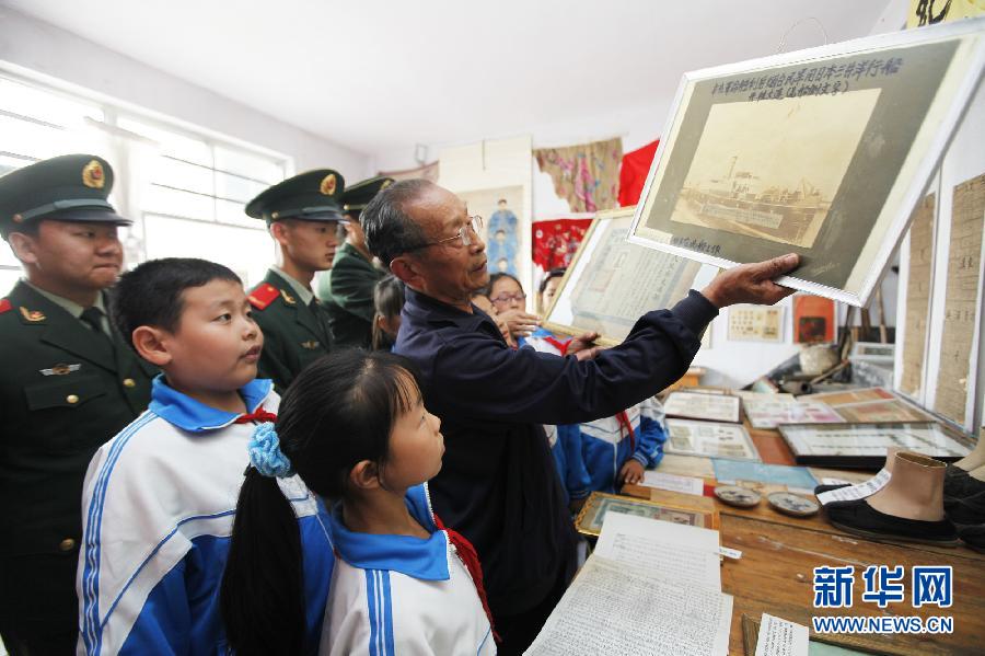 10月8日,戴玉山(右一)向参观者展示辛亥革命胜利后烟台的老照片。当日,山东荣成市退休老干部戴玉山自办的纪念辛亥革命100周年文献资料收藏展开幕,展出其收藏的辛亥革命相关历史文物200多件,包括杂志、手抄本、邮票、钱币、老照片和胶东地区辛亥革命烈士遗物等。新华社发(王福东 摄)