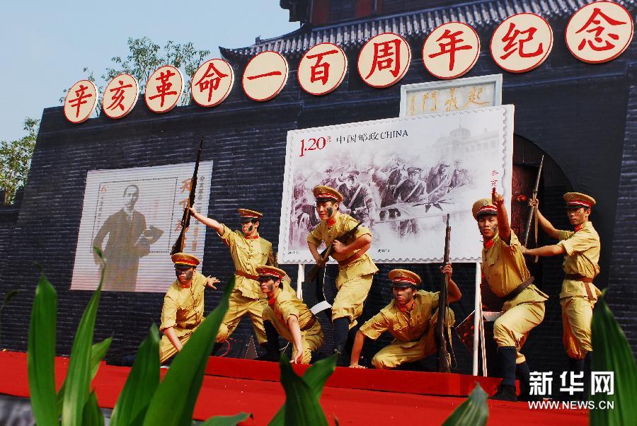 10月10日,演员在《辛亥革命一百周年》纪念邮票首发仪式上表演。当日,中国邮政在武汉辛亥革命博物馆举行《辛亥革命一百周年》纪念邮票首发仪式。《辛亥革命一百周年》纪念邮票为“武昌起义”和“推翻帝制”1套2枚,小型张1枚为“中国民主革命的伟大先行者——孙中山”。新华社记者 肖艺九 摄