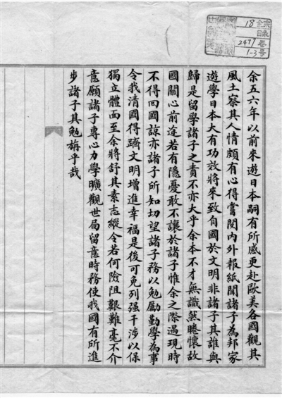 1905年孙中山在东京对留日学生的演讲词(资料照片)。新华社发