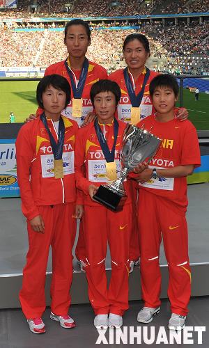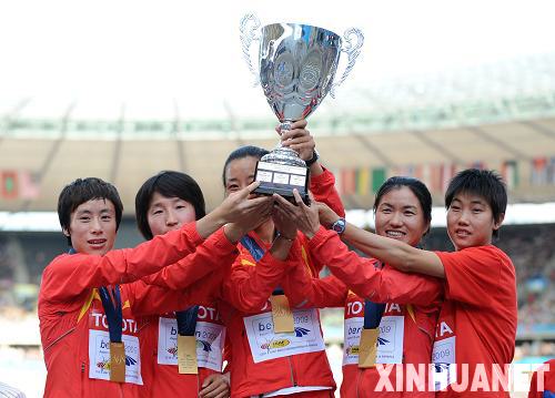 8月23日,在德国首都柏林举行的世界田径锦标赛女子马拉松颁奖仪式上,中国队队员集体举起奖杯。当天,中国运动员白雪(下排中)以2小时25分15秒的成绩获得世锦赛女子马拉松冠军,为中国队赢得本届大赛上的第一枚金牌。中国队同时也获得世锦赛马拉松团体第一名。新华社记者武巍摄