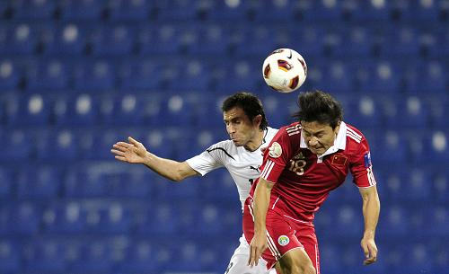 1月16日,中国队球员郜林(右)争顶。当日,在多哈举行的亚洲杯足球赛A组比赛中,中国队对阵乌兹别克斯坦队。