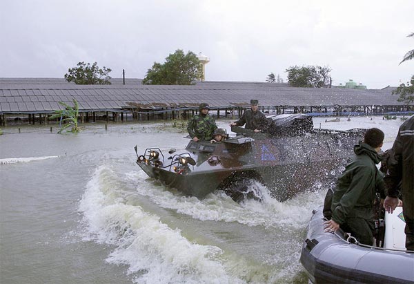 台媒图片:台陆军装甲车辆在洪水中搜寻。