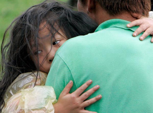 台媒图片:一位获救的小女孩乘坐台军方直升机降落到旗山中学。