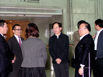 农业部副部长危朝安(右三)19日抵台,傍晚与大成集团总裁韩家寰(右二)趋车至101造访,登楼前与101执行副总赵国帅(左一)谈天说地。图片来源:"中央日报"网络报