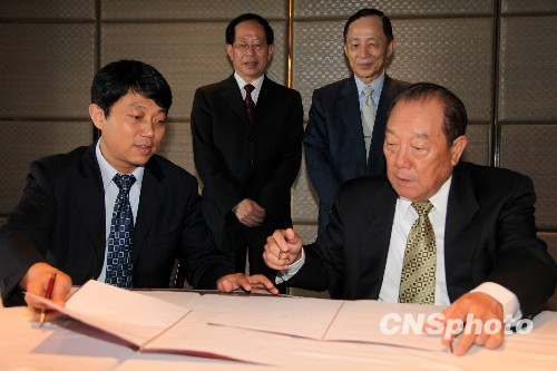 5月20日,在首度访台的海峡两岸农业交流协会名誉会长危朝安(后排左)和台湾二十一世纪基金会董事长高育仁见证下,双方代表签订2010年合作备忘录,将在年内合作举办“第二届两岸乡村座谈”等活动,深化两岸农业、基层农民交流。 中新社发 董会峰 摄
