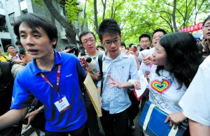 昨日北大五四路上迎来了一群新鲜的面孔,而李戡绝对是其中的“超级明星”。早上8点,两岸三地的记者就在经济学院报名处“蹲点”。10点左右,身材清瘦、穿着白底黑条纹衬衫的李戡终于现身,面对媒体的围追堵截,他应对大方得体,承认上北大是受父亲的影响。前来送行的母亲则希望媒体的关注只限于近几日,开学后能让孩子平静安心地学习。