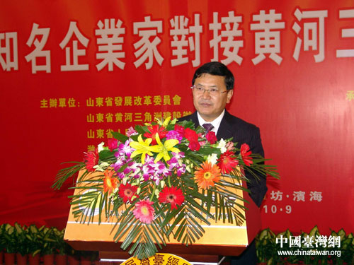 东营市政府副市长高一在海峡两岸知名企业家对接黄河三角洲战略合作推介会上致辞(图片来源:东营市台办)