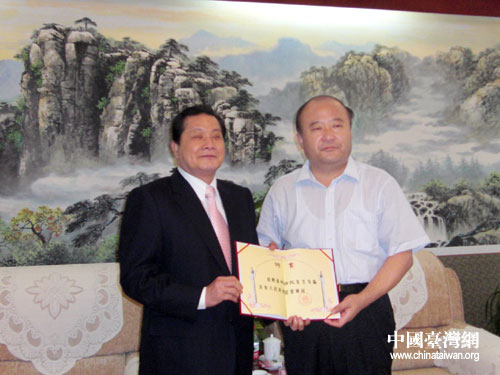 临沂市委副书记、市长张少军向台湾农产品流通经济人协会会长林瑞民颁发聘书。