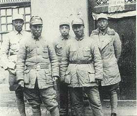 1940年摄于山西,左起:罗瑞卿、吕正操、彭德怀、朱德、聂荣臻。1940年8月20日晚10时,正太路第一战役打响,“百团大战”开始,冀中区十万以上群众配合部队进行破路和反击。据吕正操回忆:“从8月20日至9月20日,冀中区平毁公路、铁路500多公里,炸毁铁桥、木桥20座,收电线13000多公斤,毙伤日伪军1300多名。我军伤亡400多名。”
