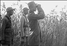 1942年日军五万余人对我根据地进行“拉网大扫荡”。这是冀中军区司令员吕正操在前线观察。