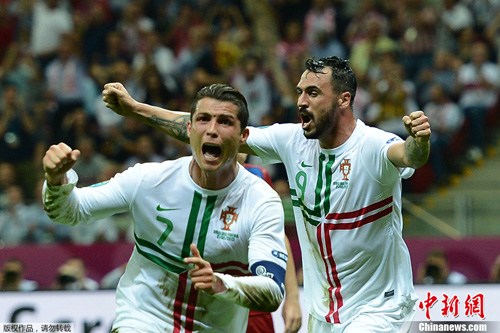 中新社北京6月22日电 华沙消息:2012年欧洲杯四分之一决赛当地时间21日晚拉开帷幕。葡萄牙队凭借克里斯蒂亚诺?罗纳尔多(C罗)下半场的关键进球1球小胜捷克,挺进半决赛。