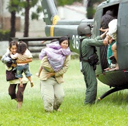 台陆军空骑旅出动直升机至小林部落救出19位居民至旗山镇收容就医,居民抱著小孩快步离开直升机。图片来源:台湾《中国时报》