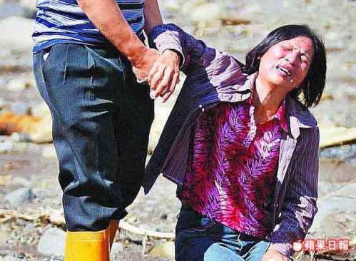 仰天悲鸣,家园不在,前来寻亲的妇人潘金贵跪地痛哭。来源:台湾《苹果日报》