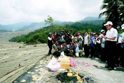 马英九与高雄县长杨秋兴等官员捻香向罹难者致祭,望着全遭土石掩埋的小林村,肃杀场景让马英九神情极为凝重。