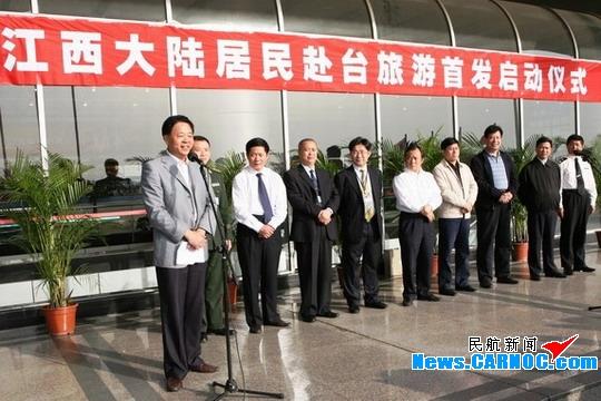 上午7时30分许,江西大陆居民赴台旅游首发启动仪式在南昌昌北国际机场举行。江西省旅游局副局长王林云在讲话中寄语首发团,要带着江西人民的热情、友好进入宝岛台湾,向台湾民众展示“开放和谐文明”的江西老表形象。江西省机场集团公司总经理万林出席仪式。
