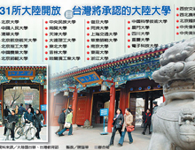 今年起,台湾高中毕业生,只要学科能力测试(学测)成绩达“顶标级”,即可免试申请包括北京大学、清华大学等大陆一百二十三所大学。台湾参加学测考试考生一年约十五万人,成绩达到顶标的约为总数的前百分之十二,将近一万八千人,可直接向大陆一百二十三所大学申请就读,经面试合格后即可录取。