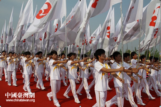 图为由81名大学生组成的薪火方阵。大学生们高举的旗帜,意气风发,情绪激扬,喻示着华夏文明薪火相传,生生不息,昭示着伟大的时代精神与优秀的传统文化一脉相承、本正源清!(中国台湾网 徐维彬 摄)