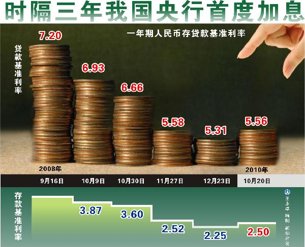 新华网北京10月19日电(记者王宇、姚均芳)出乎市场的意料,中国人民银行19日晚间突然宣布,自2010年10月20日起上调金融机构人民币存贷款基准利率。这是我国央行时隔3年后的首度加息,央行为何选择此时加息?加息是否意味货币政策突变?加息对金融市场和房地产市场将产生怎样的影响,新华社记者就此采访了相关的专家和学者。