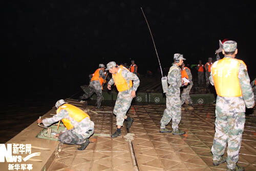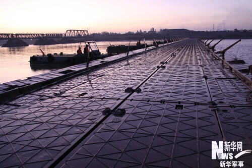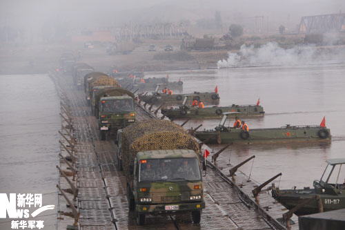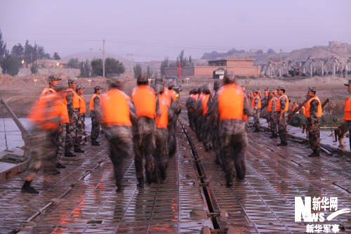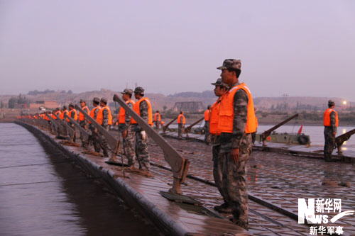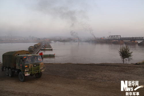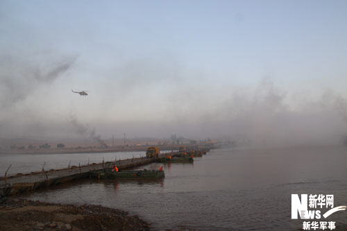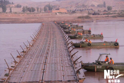 新华网消息:"跨越-2009"实兵检验性演习11日开始空中、铁路和摩托化立体远程机动。凌晨5时,兰州军区某师摩托化机动伊始,预定机动路线桥梁"被炸"。兰州军区某舟桥团奉命前来增援,在黄河某渡口架设了一座长250多米长的浮桥。6时整,机动部队从桥上驶过向演习地域开进。