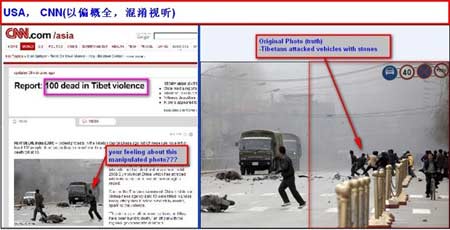 声明中写道:“一个叫‘anti-CNN.com’的网站和其他一些地方对于CNN在西藏事件上的报道点名批评。”对于中国网民对CNN将一张图片中“藏独”分子向卡车投掷石块的画面进行剪裁的不满,CNN辩称,“受到质疑的那幅照片被完全‘适当地’应用在了特定的编辑内容中”,并称所展示的内容不会引起误解。