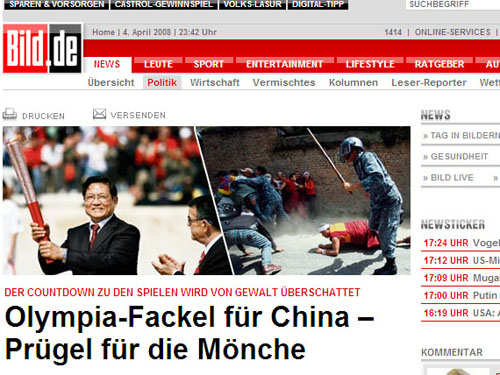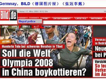 然而,CNN并不是唯一一家歪曲报道西藏事件的媒体,也不是最有“创意”的媒体。《德国画报》在最近的报道中所使用的图片显然比CNN更有“才”。《德国画报》多次将尼泊尔警察在加德满都驱散游行示威者的图片进行裁剪、拼接,然后配在谈论北京奥运的文章中,标题竟用“西藏事件升级,应该抵制奥运会吗?”(人民网4月5日电)