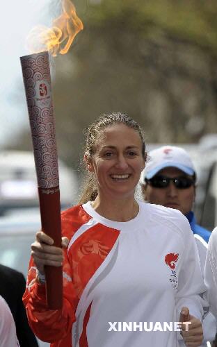 4月7日,奥运火炬手皮尔斯手持火炬传递。当日,北京奥运圣火传递活动在法国巴黎举行。 新华社记者戚恒摄