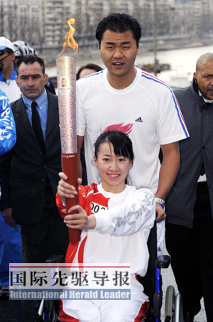 4月7日中午时分,作为巴黎段第三棒火炬手的她,正在等待第二棒火炬手到来时,“藏独”分子突然上来抢她手中的火炬。