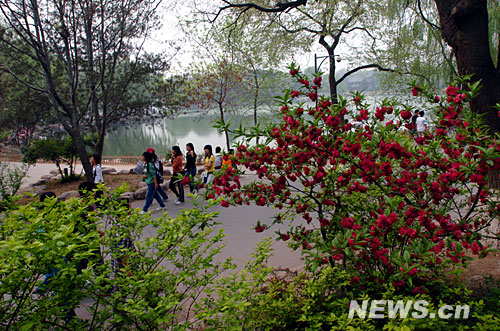 4月19日,学生从桃花盛开的北京大学未名湖畔走过。新华网 文涛 摄