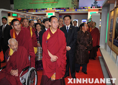 5月4日,第十一世班禅额尔德尼·确吉杰布来到北京民族文化宫,参观正在这里举办的“西藏今昔”大型主题展。 新华社记者刘建生摄