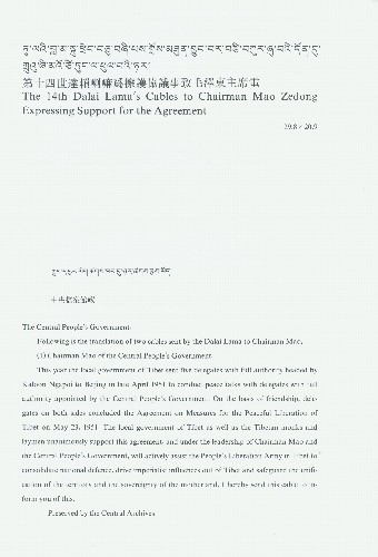 中央人民政府毛主席:今年西藏地方政府特派全权代表噶伦阿沛等五人于1951年4月底抵达北京,与中央人民政府指定的全权代表进行和谈。双方代表在友好基础上已于1951年5月23日签订了关于和平解放西藏办法的协议。西藏地方政府及藏族僧俗人民一致拥护,并在毛主席及中央人民政府领导下积极协助人民解放军进藏部队巩固国防,驱逐帝国主义势力出西藏,保护祖国领土主权的统一,谨电奉闻。