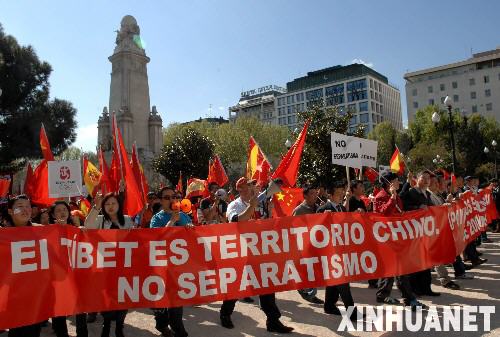 4月14日,西班牙上千名华人华侨和留学生在马德里市中心的西班牙广场举行游行集会活动,反对西藏分裂,反对西方歪曲报道,维护统一,支持北京奥运。 新华社记者陈海通摄