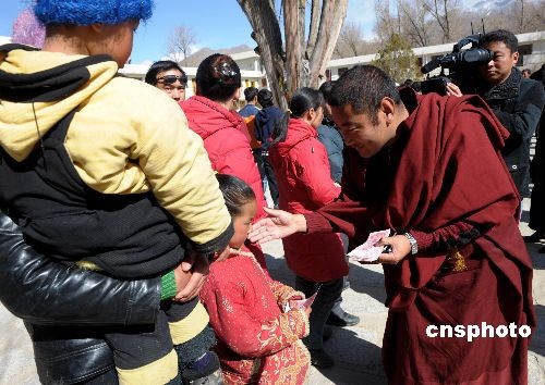 拉萨大昭寺的僧人到拉萨救助站慰问打砸抢烧事件中的受害者。