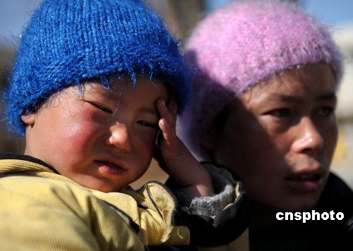 在拉萨市救助站内接受救助的一对母女。3月22日,拉萨大昭寺的僧人到拉萨救助站慰问打砸抢烧事件中的受害者,并向他们发放了慰问金。中新社发 廖攀 摄