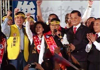 国民党倾全党之力,为黄俊英拉抬选情,12月3日下午3点“1203救台湾”大游行登场,国民党主席马英九、台“立法院长”王金平和国民党荣誉主席连战都现身辅选。(图片来源:台湾东森新闻)