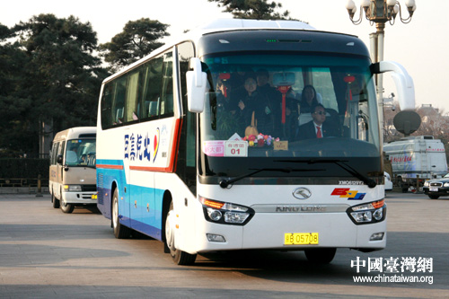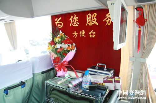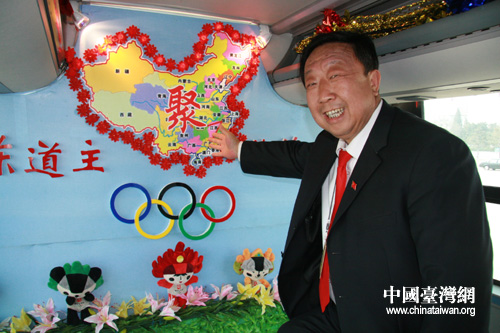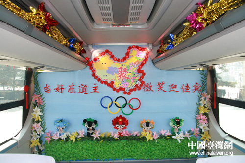 接待人大台湾代表团的客车,在两会中独一无二。作为全国人大台湾代表团的专职司机,北汽集团的唐桂林师傅将汽车打扮得很有特色,车厢两侧挂满拉花,最精彩的在车厢最后——一幅中国地图,五个福娃,一个“聚”字熠熠生辉。