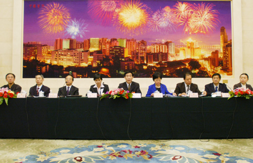 3月11日上午,全国人大常委会法制工作委员会在人民大会堂小澳门厅举行记者招待会,就五年来我国的立法工作回答记者提问。图为发布会主席台。新华网 陈竞超摄