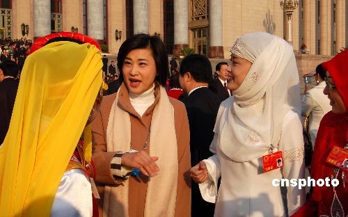 3月5日,十一届全国人大一次会议在北京人民大会堂开幕。香港凤凰卫视名主播吴小莉(左二),会前在大会堂前采访少数民族代表。 中新社发 刘万强 摄