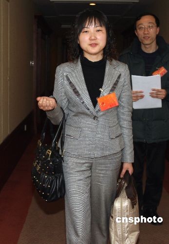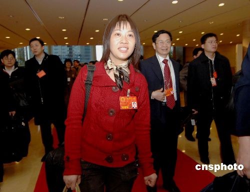 3月2日下午,来自上海的农民工代表朱雪芹,随同人大上海代表团抵达驻地北京京西宾馆,将代表亿万农民工首次出席十一届全国人大一次会议。 中新社发 任晨鸣 摄