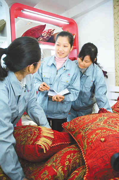 浙江代表团的杨晓霞代表是宁波市外来务工明星之一。图为进京前,杨晓霞代表(中)来到姐妹们中间,倾听大家的心声。孙晓青 丁继敏摄影报道