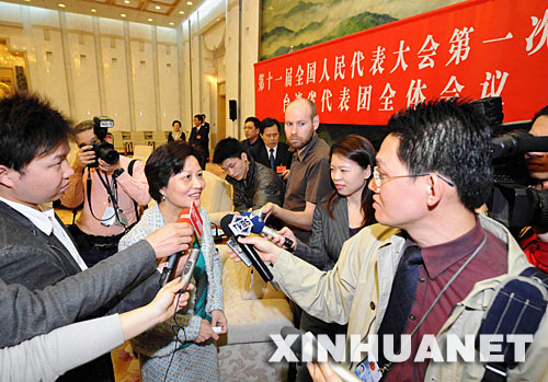 3月10日,出席十一届全国人大一次会议的台湾省代表团审议最高人民法院工作报告和最高人民检察院工作报告。这是全国人大代表陈云英在接受记者采访。 新华社记者李涛摄