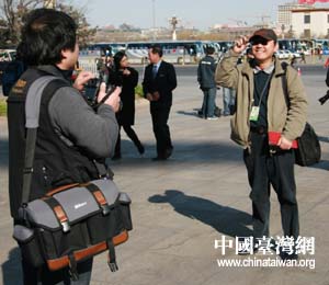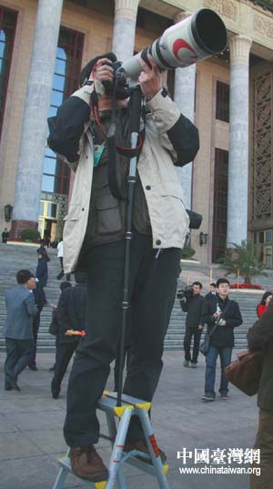 中国台湾网3月3日北京消息 中国人民政治协商会议第十一届全国委员会第一次会议今天下午在北京人民大会堂开幕。今年采访政协全体会议的国内外新闻媒体共有400余家,记者3000多人。经常躲在镜头背后的媒体同行们,今天也成为了记者镜头的主角。(张弛 摄)