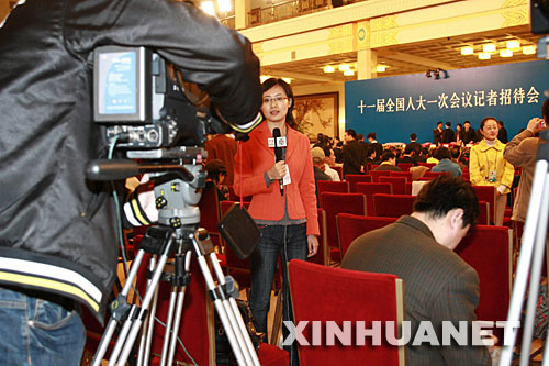 3月18日上午8时30分,人民大会堂三楼记者席已是“座无虚席”。这是电视记者在现场试镜。 新华社记者尹栋逊摄