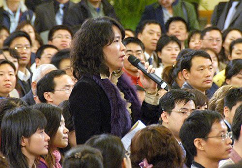 3月18日,国务院总理温家宝和副总理李克强、回良玉、张德江、王岐山在北京人民大会堂与中外记者见面,并回答记者提问。图为台湾工商时报记者在提问。新华网 郭毅 摄