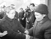 2003年12月18日,河南上蔡县芦岗乡文楼村,吴仪拉住艾滋病患者的手,询问她的病情。 |